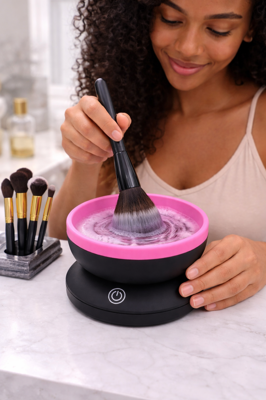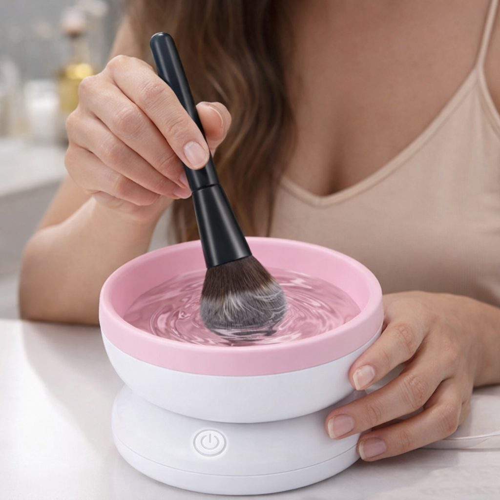 Denna elektriska rengöringsenhet är avsedd för rengöring av sminkborstar. Den är utrustad med en motor som roterar borsten i en silikonbehållare för att avlägsna sminkrester och smuts.