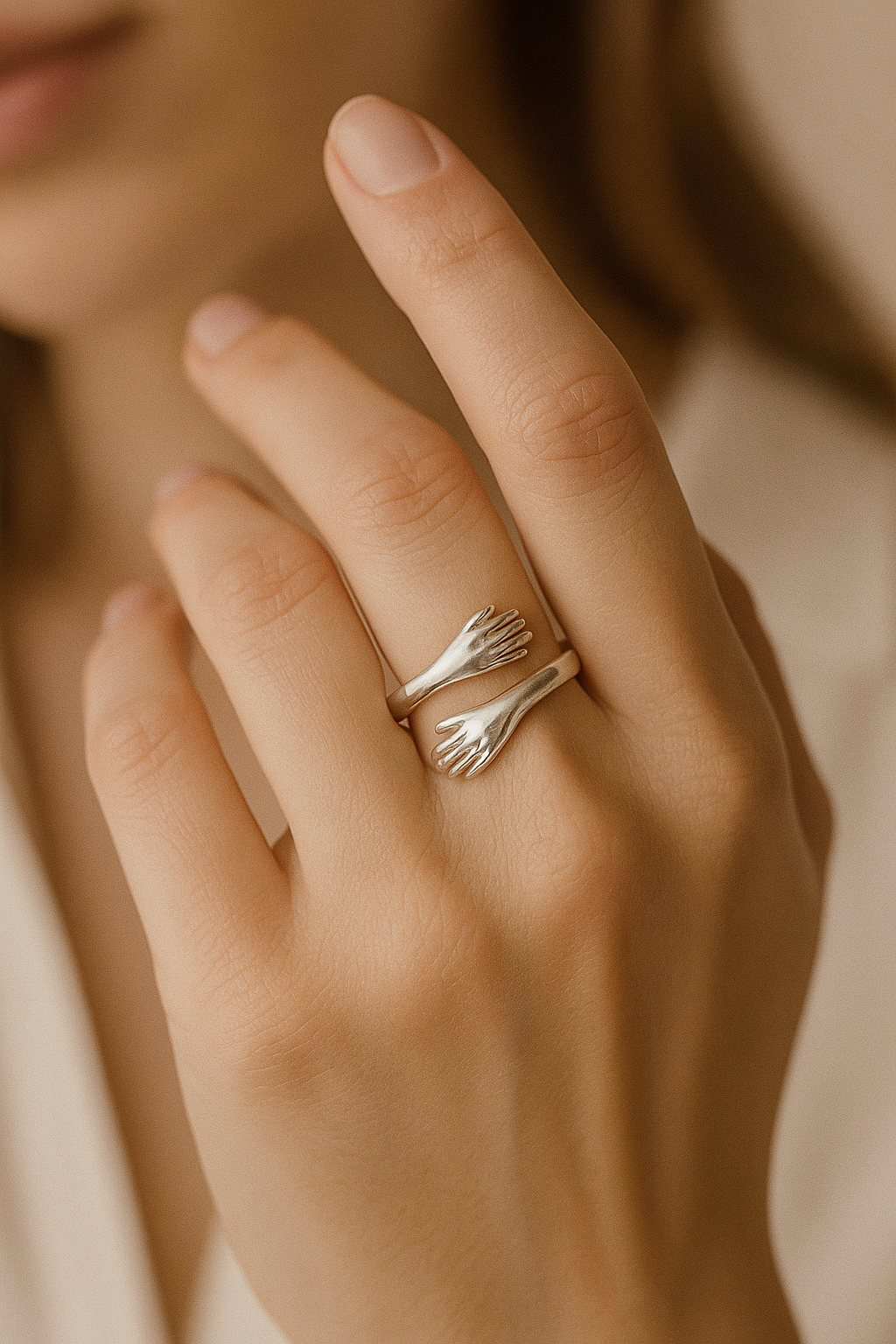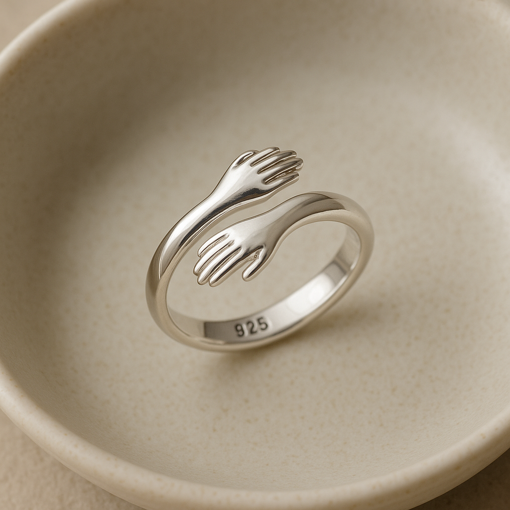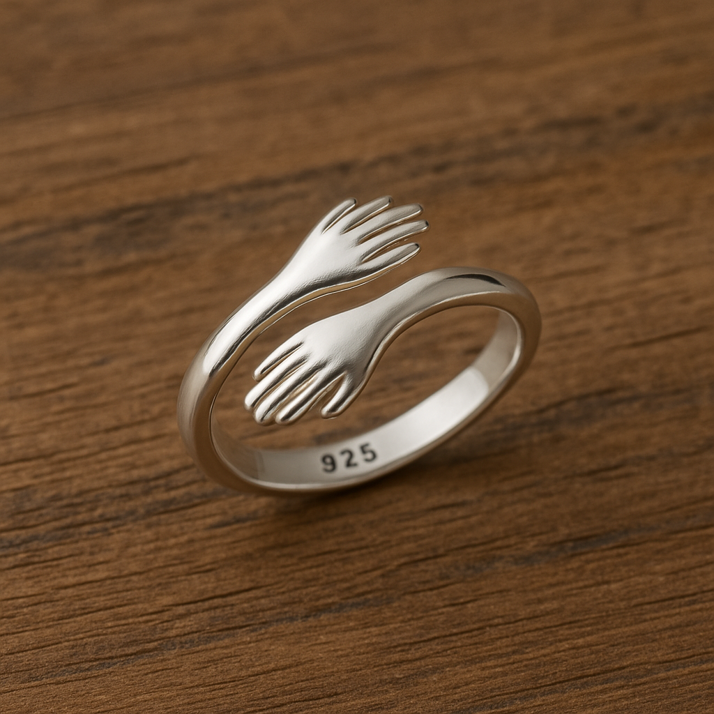 En elegant och symbolisk ring i högblankt silver, formad som två händer som möts i en omfamning. Den representerar kärlek, trygghet och samhörighet – en påminnelse om att alltid hålla fast vid det som betyder mest. Perfekt som gåva till någon du håller kär eller som en personlig symbol för egen styrka och närhet.