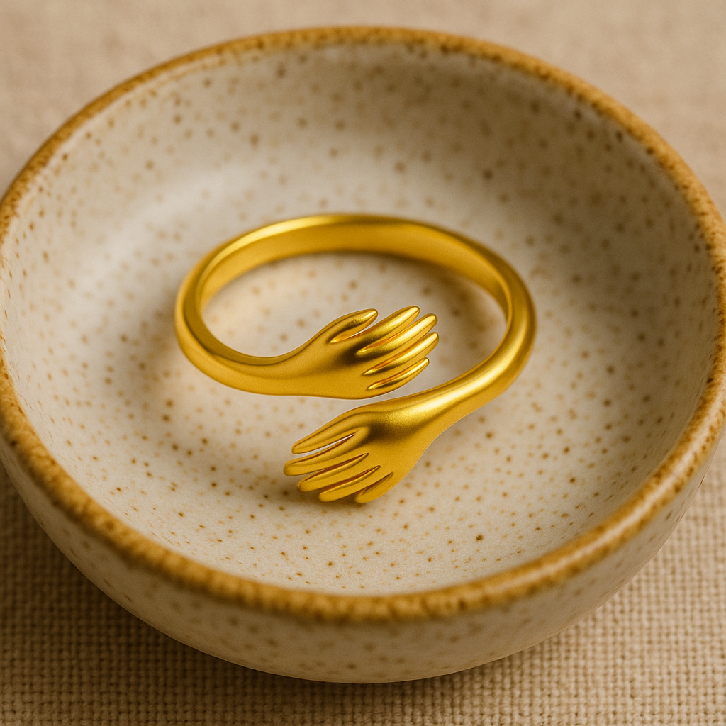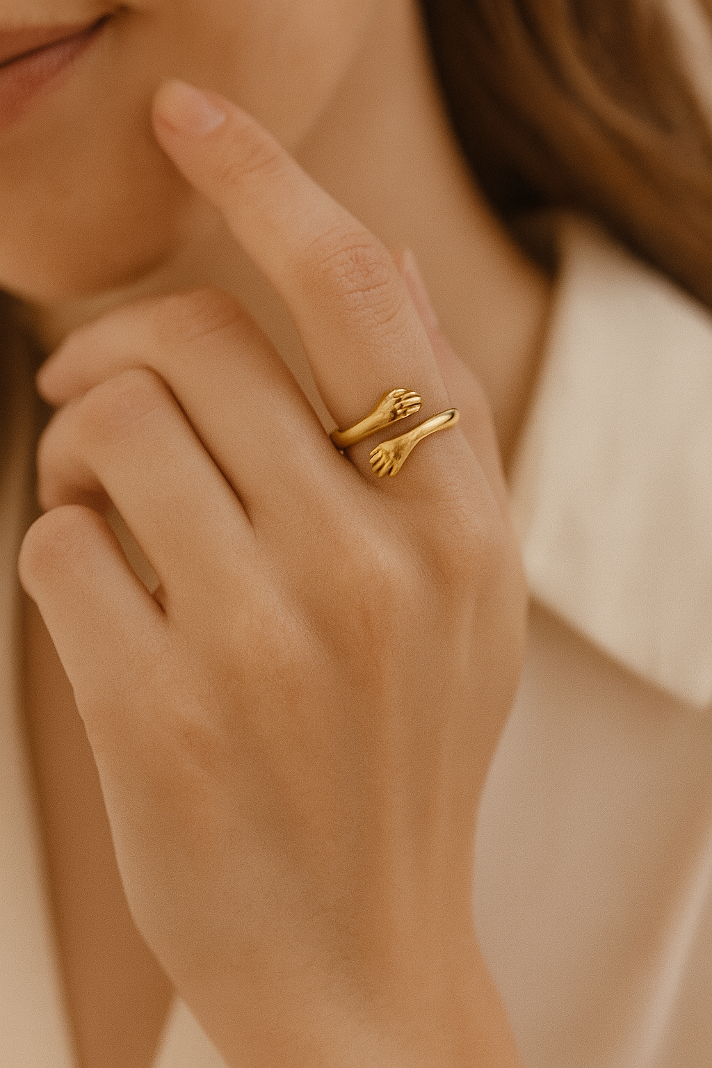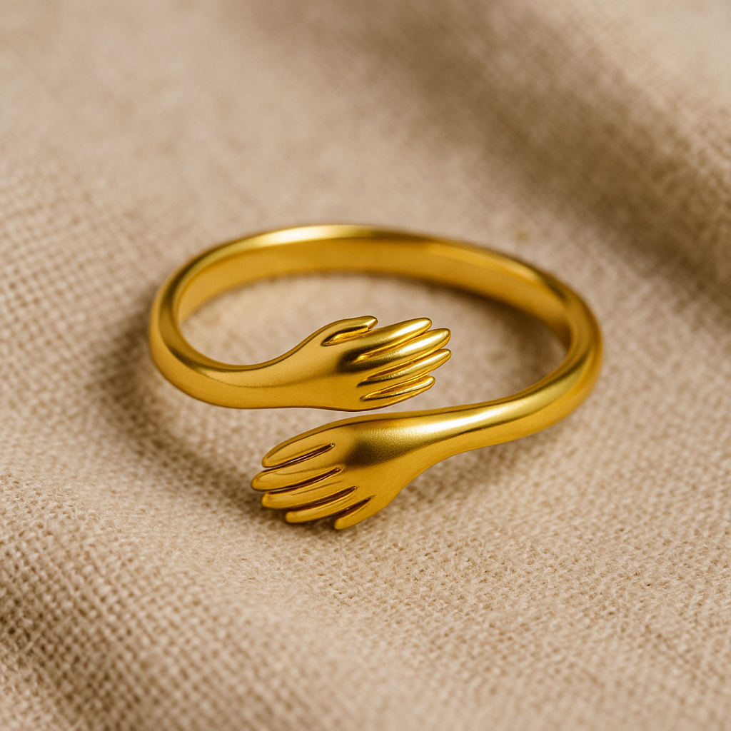 En elegant och symbolisk ring i högblankt silver, formad som två händer som möts i en omfamning. Den representerar kärlek, trygghet och samhörighet – en påminnelse om att alltid hålla fast vid det som betyder mest. Perfekt som gåva till någon du håller kär eller som en personlig symbol för egen styrka och närhet.